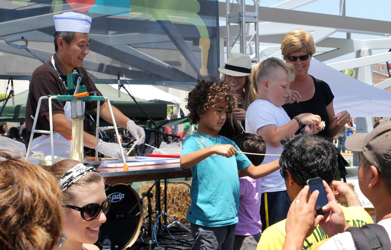 The crowd getting into the noodle-pulling demo by Mr. Yang of Mandarin Noodle Deli– Smiles all around!