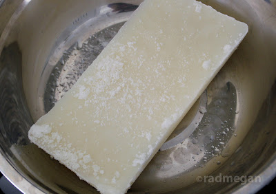 When all of the wicks were glued into the shells, I melted my bees wax on the stove, using a double boiler.