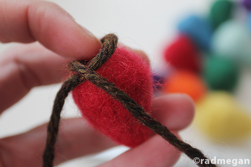 When I had about a dozen light bulbs felted and trimmed, I grabbed my ball of yarn. I measured out about twelve inches, and then selected a small (inch-long) segment of yarn to coil around the top of one of my needle-felted bulbs. By leaving a foot of slack at the ends of your light garland, you allow yourself enough yarn to tie your garland up.