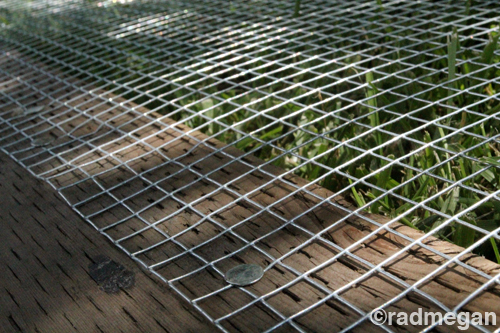 In the soft grass, we nailed half-inch hardware cloth to the underside of the wooden frame to protect against any below-ground chicken attacks.
